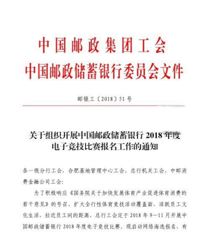 2018年9月,一份“邮银工[2018]51号”红头文件让邮储银行成为电竞爱好者关注的焦点。这份《关于组织开展中国邮政储蓄银行2018年度电子竞技比赛报名工作的通知》文件的内容如它的标题一样出人意料——一家国企银行,想要花两个月的时间举办一场企业内部的电竞比赛,范围涵盖下属各个分行,比赛项目为《王者荣耀》。