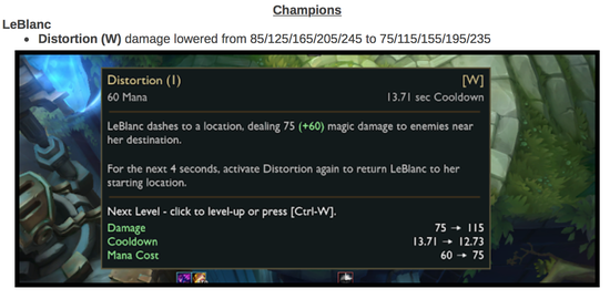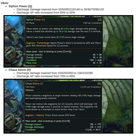 混乱风暴(R):造成伤害由150/250/350 降低至 130/210/290,AP加成由 70% 提升至 85%