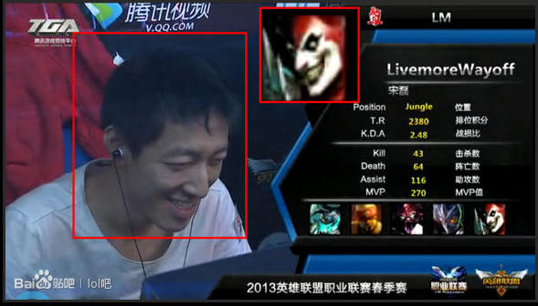还记得这张神似小丑的迷之微笑吗?2013年LPL春季赛对阵WE的第一轮比赛中,顶着LivemoreWayoff的ID的宋磊拿出了自己在rank中成名已久的小丑。在这局比赛中,名不见经传的LM利用宋磊的无限分推让WE在人头,经济都处于优势的情况下反而被围困在基地束手束脚。最终面对单挑已然无敌的小丑,WE丧失了抵抗的资本。这一战让LM一战成名,也让广大玩家记住了这个瘦瘦的小伙子。