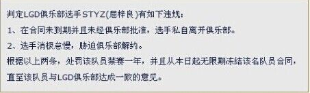 但这位天才AD的命运可谓是一波三折。在夏季赛,面对其他战队的邀请,年少的Styz做出了愚蠢的决定:消极比赛以求俱乐部开除。而他的消极态度引起了LGD俱乐部的追查,最终查明了事情真相。L.ACE联盟对于此事做出了判决:Styz禁赛一年(后因态度良好,减为半年)。