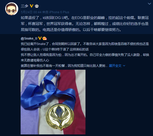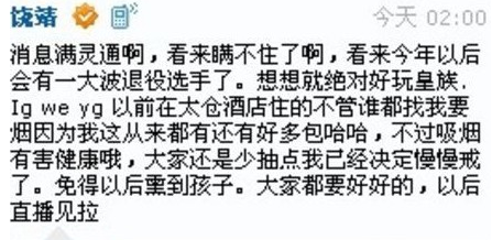 而此后不久,JING便在微博发声,称自己由于女友有了身孕,将回老家结婚,也将告别职业赛场。他的位置将由替补打野青稚顶替。许多圈内人士纷纷送上了对JING的祝福。而PE战队官方也发出了长微博,细数JING在PE的点点滴滴,并表示,JING永远是PE的一员。