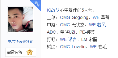 而宋磊的出色发挥也得到了顶尖职业选手的认可。在2013年全明星投票环节,宋磊的头像赫然在列。而IG众将则一致认为,宋磊是可以与诺言比肩的打野选手。
