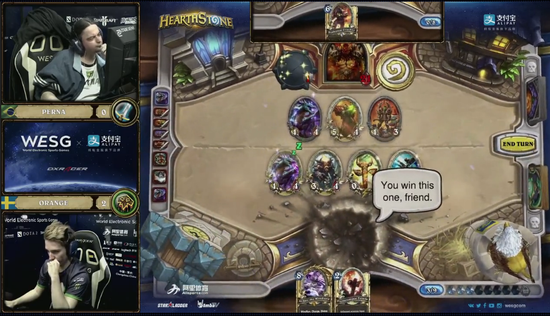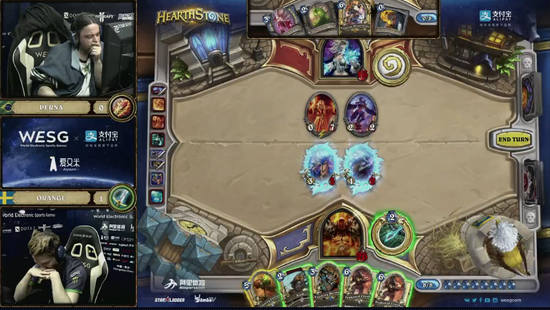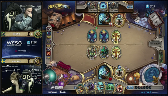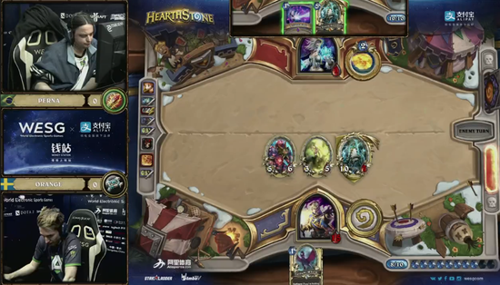 WESG第一场登上主舞台的炉石比赛是由炉石名将Orange对战巴西选手Perna。
