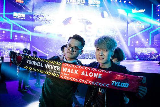 一条红黑双色丝带,上面写着You will never walk alone(你永不孤单),代表了这位CS:GO铁杆粉丝对于中国CS:GO真诚的祝福。他们带着这条全手工打造的丝带访遍全场每个中国战队,TYLOO、5E、VG一个不落。“真心希望中国战队能够打出好成绩,也希望天禄战队能够跨过眼下的困难。”这些选手们也无一不和这位铁杆粉丝握手合影,相谈甚欢。