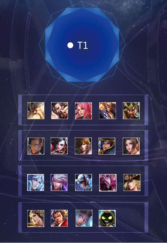 T1:老夫子 曹操 花木兰 杨戬 关羽 达摩 阿轲 李白 刘备 不知火舞 诸葛亮 高渐离 露娜 干将莫邪(高连招伤害手长) 马可波罗 虞姬 张飞 东皇太一 太乙真人