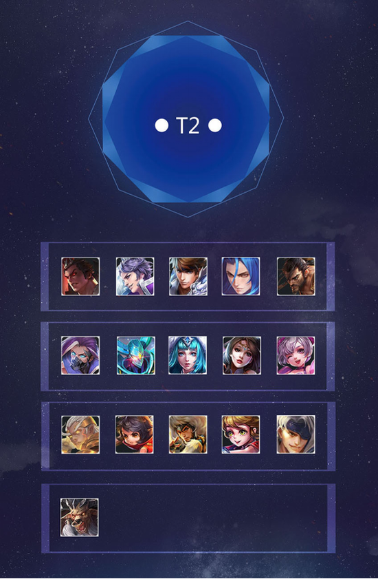 排名详解:T1是版本强势英雄,BP位常客。T2是版本常规英雄,可以进入常规阵容轮换且能发挥较稳定作用。T3是补位英雄,该梯队英雄功能性较强,虽实用性较之T1T2不够全面,但是在T1T2的某一个位置被BP针对的时候可以上场。T4是潜力英雄,因之前改动或现阶段环境受到发挥上的限制,经历版本改动或套路开发后很可能重新进入前列梯队。T5是弱势英雄,因大环境及同位置英雄的强势而导致无法登场。