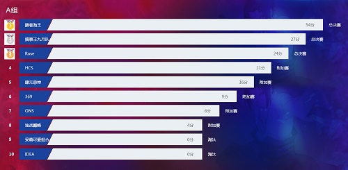 最终A组的比赛由胜者为王领跑,搞事王九月队、ROSE两队也凭借着积分的优势直接晋级到决赛。而HCS、肆无忌惮、369、ONS、独占巅峰则保留进入决赛的机会,进入到下一路的附加赛阶段。