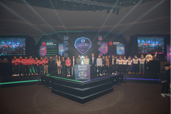英皇集团主席杨受成博士(上排右六)、英皇娱乐集团行政总裁许佩斯(上排左四)、英皇集团战略发展执行官杨政龙(上排右七)、太平人寿保险﹝香港﹞有限公司行政总裁王鑫(上排左七)、香港电竞总会主席周启康(上排左三)与张敬轩、卫诗雅、汤怡、陈家乐及麦子乐一起,和两强队伍Team Orion(下排白衣队伍)及No Fancy(下排红衣队伍)一同留影。