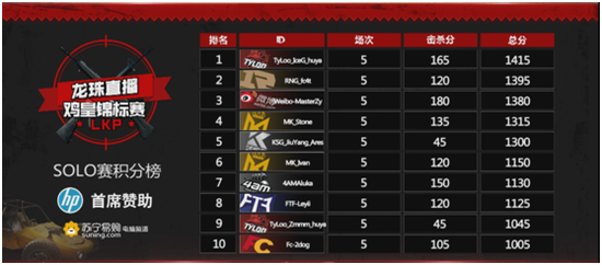 而在4月6日——7日,LKP鸡皇锦标赛将在线下举行团队决赛,20支国内顶尖战队将倾力参战,敬请关注!本次赛事更是得到了苏宁易购电脑频道以及惠普电脑的大力支持。