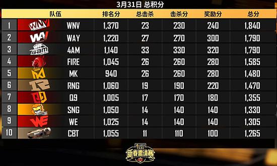 今天的五场比赛中,wNv作为决赛圈常客,多次把胜利拱手让人,虽然没能吃到鸡,但是凭借稳定的发挥还是拿到了今天第一名的1840积分。