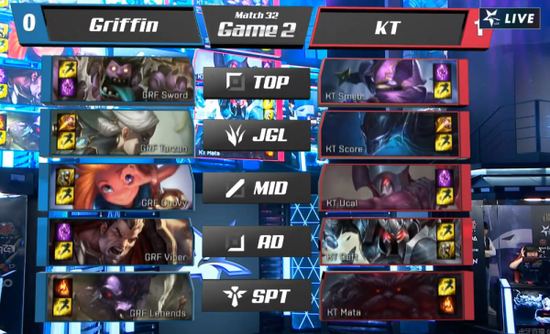 6月28日,LCK夏季赛第三周第三天第一场比赛由KT对战目前的第一名GRF,至今未尝一败的GRF面对KT节奏全无最终被KT 2-0终结连胜。