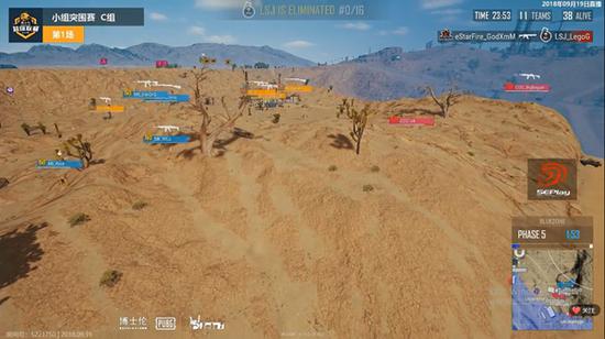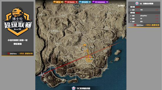 安全区刷往北部,SC占据了圈内最好位置,可以看到圈中心的几支队伍形成了交叉火力,其他队伍想要进圈将会遭受猛烈火力打击。