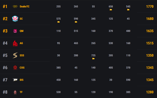 安全区逐渐收缩,场上只剩8队24人,SNAKETC满编占据天命圈山头,略占优势。elephant独狼被COG带走,EDG两人被SNAKETC与estarfire联合打击团灭,estarfire稍作休整,向SANKE冲锋,另一边IDS趁机同时冲锋,吃掉SNAKE后又带走estarfire,场上还剩4队10人。蓝圈再次刷新,COG独狼击倒TF一人后被带走,SC隐身许久后突然发力,击倒IDS一人,与此同时TF也发力企图一打三,可惜子弹耗尽被反杀,最终SC成功吃鸡。