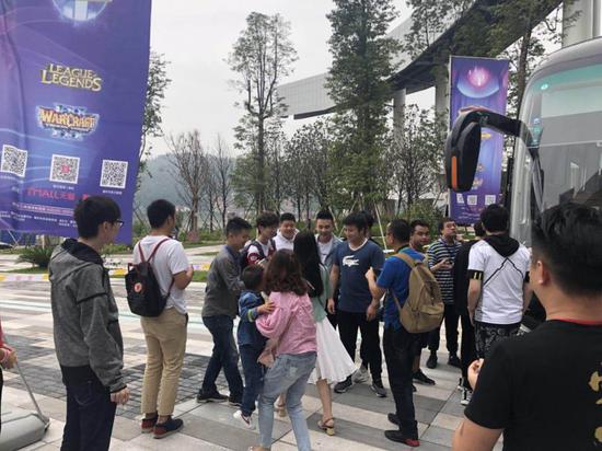 比赛结束后,粉丝纷纷驻足战队大巴前合影留念
