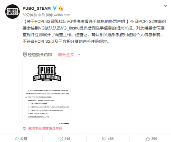 【关于PCPI S2晋级战队VG提供虚假选手信息的处罚声明】今日PCPI S2赛事组委会接到VG战队队员VG_linshu提供虚假选手信息的相关举报。对此组委会高度重视并立即展开了调查工作。经查证,确认相关选手系使用虚假个人信息参赛,不符合PCPI S2以及三方积分赛的选手注册规定。