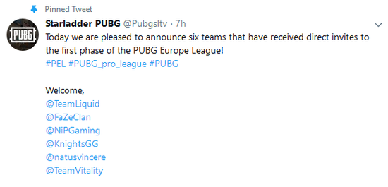 PUBG和Starladder联合举办的欧洲职业联赛将于2019年1月正式打响。今日Starladder就宣布六支战队获得了第一阶段比赛的直邀资格,他们分别为:Liquid、FaZe、NIP、Knights、Navi以及Vitality。
