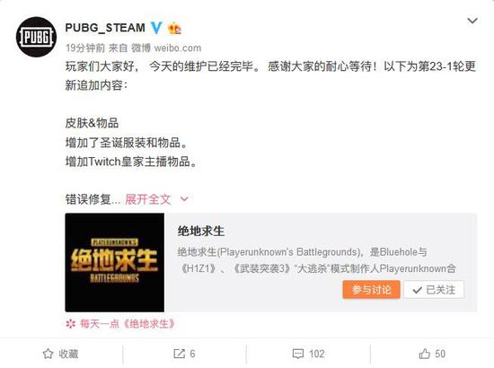 昨天,PUBG官博宣布更新完成,并追加了圣诞服装和物品与Twitch皇家主播物品。