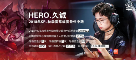 从数据上看,秋季赛常规赛累计输出9079311,稳居全联盟第一。个人伤害占比最高达53.5%,周最佳选手4次、周最佳阵容3次,局最佳选手20次,分均输出6753,输出伤害占比超36.61%,经济转输出10.64,领跑全联盟,霸榜第一。在2018年KPL秋季赛常规赛最佳阵容的评选中,久诚从数据上、表现上力克竞争对手—RNGM.暴风锐,凭借着精湛的操作和在队伍中的核心力量荣获最佳中路。这一奖项实至名归,不仅代表着KPL赛场对久诚的认可,也代表着所有人对久诚的期望和支持。