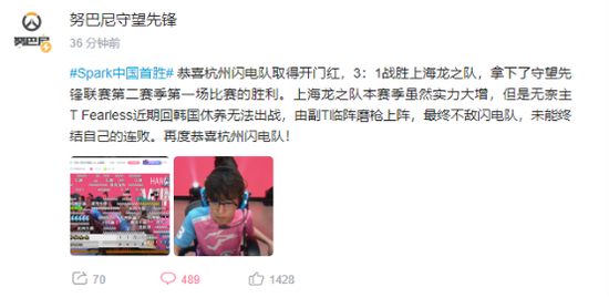 OWL新赛季刚刚开打就能看到中国区战队的积极表现,确实让粉丝高兴。再次恭喜杭州闪电队Spark获得中国首胜,也希望他们能再接再厉打好后面的比赛,为中国电竞贡献力量。