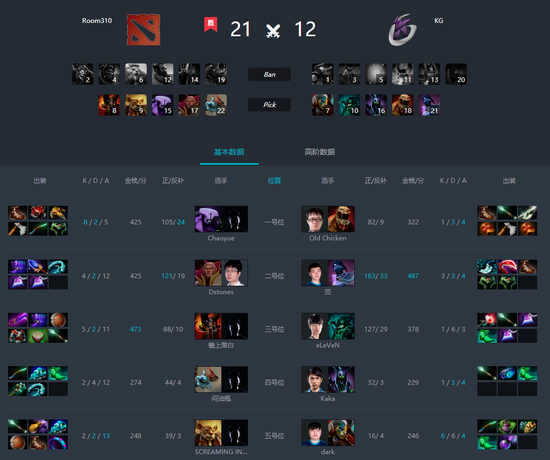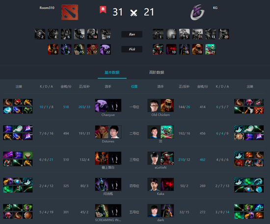 比赛中,KG前期并没能取得像上一局那样打穿两路的巨大优势,反而是被Room310这边给冲得头晕眼花。Doom走上来就是一刀,再加上双头龙和酒仙这两个团战搅屎棍,KG这边除了小狗有魔免可以上去输出之外其他人只能在后边OB。而且还有一手虚空的大招克制小狗,23分钟一波团战失利后,知道已经没有翻盘希望的KG直接打出了GG。Room310爆冷以2:0击败对手挺进下一轮。