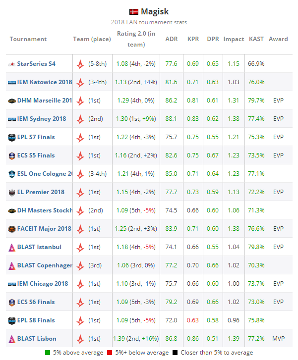 因为Magisk在各方面的数据都较为出色。首先,在2018年16项赛事中他的平均Rating达到1.06之多。其次在大型赛事74.4%的地图中,他仍有1.00以上的评分。最后他以排名第二、74.5%的恐怖KAST一锤定音。