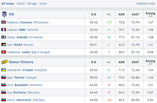 在决胜图上电子哥的低迷完全无法阻挡OG的外场进攻,反观Aleksib以及ISSAA的出色突破帮助OG在进攻端连取7分,默认与快攻相结合的办法让s1mple根本无法完全施展拳脚,上半场做CT端的NaVi仅仅拿下不及格的7分。双方攻防转换过后OG成功再取手枪局基本大局已定,最终OG以16-12击败NaVi成功以BLAST PremierA组头名晋级淘汰赛。