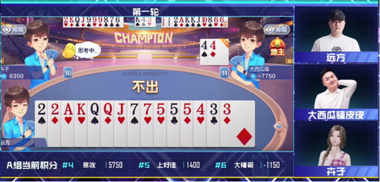 参与A组比赛的选手有:远方、上好佳、泡沫甜田、星星、卉子、大锤哥、小博、寒冰、大西瓜骚皮皮共计9来自虎牙直播平台各个分区的高人气主播。在第一轮的比赛中,诸位选手争相展示各路魔幻牌技,开场前4局比赛大家分差并无拉开过大。而由于运(盘)气(盘)不(打)佳(工),对局进行到尾声时冰、大西瓜、星星等人因运气不好等因数暂时落后。上好佳、泡沫甜田与远方则取得优势并包揽前三!