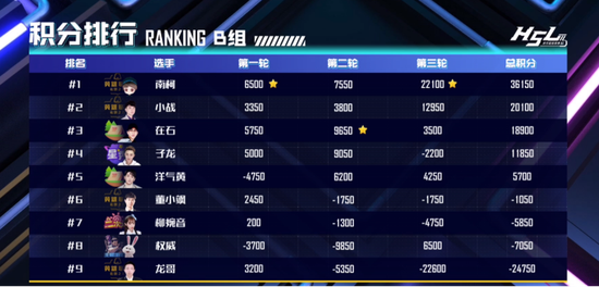 回到比赛中,第二轮在石因获得不少优势暂获第一,当场宣布“我已经稳了!”不料龙哥比赛期间惨遭掉线,沦为各路选手的“送财童子”,几轮后南柯和小站便化身黑马完成绝地反超。南柯毕竟是在云顶之弈被称为“天选之人”的主播,每轮都发挥的十分出色,获得B组第一可谓运气与实力并存,