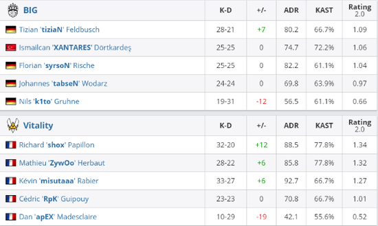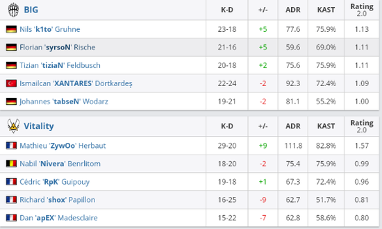 压枪下半场BIG的k1to四杀拿下手枪局,不过来到防守方后在Vitality其他三人充裕的火力支援下,ZywOo和Nivera手感渐热,BIG的进攻多是被刷屏拦截的结果,小蜜蜂在下半场可以说是“铁血防守”。图二最后由Vitality16-7获胜。