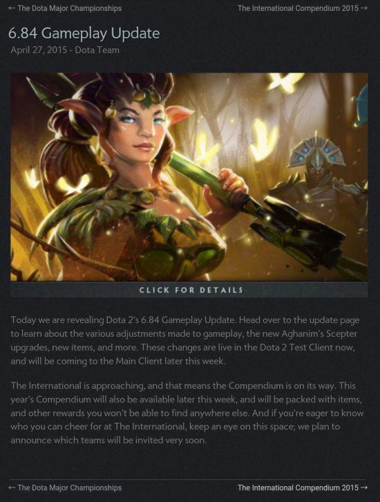 6.84版本于2015年4月被推出,是TI5的正式比赛版本。芒果、玲珑心、微光披风和清莲宝珠等装备在这个版本面世,冰龙也在这个版本中被加入到游戏里。这个版本和现在的DOTA也有很大区别,没有天赋、没有前哨、符点只有2个,肉山也住在原来的位置。