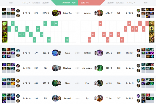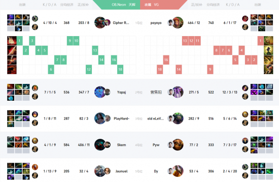 对线期三分钟,VG三路对线被压,Neon三大哥补刀领先,本以为VG应该碾压的局,总感觉有种有来有回的感觉,Neon在上一轮被QC打了个2比0整个BO2感觉这支战队并不是很强。5分钟双方在下路爆发小规模团战,双发互换人头,1分钟后Neon三人在上路对VG大圣动手,VG实行反包围,在拉锯战中反杀Neon两人,但是在追击Neon帕克的时候又被Neon反杀两人,帕克上路杀完人在TP下路击杀了老11,前8分钟Neon的帕克节奏非常完美,使得Neon在对线期过后取得了很大的优势,10分钟领先了2K经济。