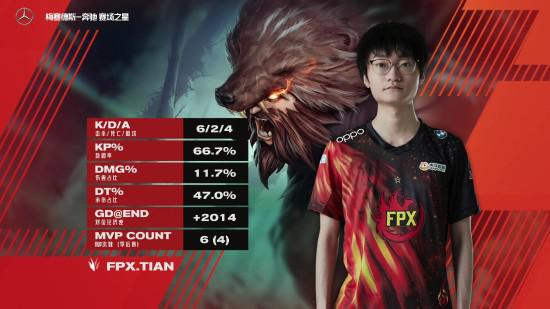 FPX战队的打野选手Tian操刀兽灵行者夺得本场比赛MVP