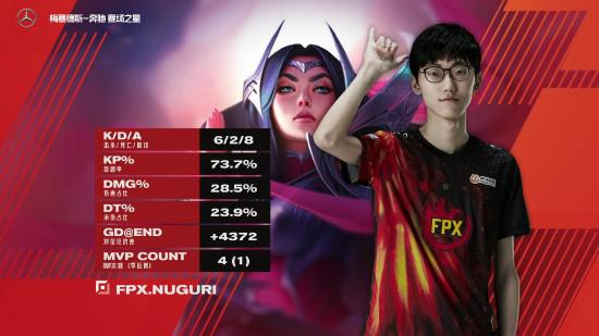 FPX战队的上单选手Nuguri操刀刀妹夺得本局比赛的MVP