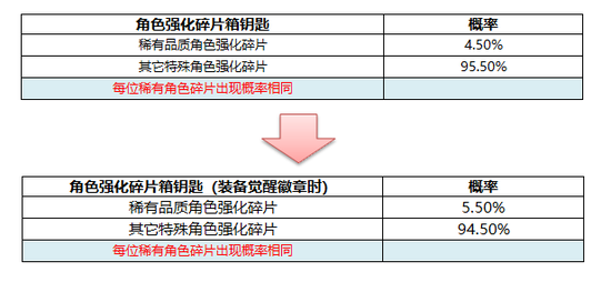 可激活觉醒勋章,觉醒属性属性为:开启角色强化碎片箱时,稀有角色强化碎片获得概率提升。