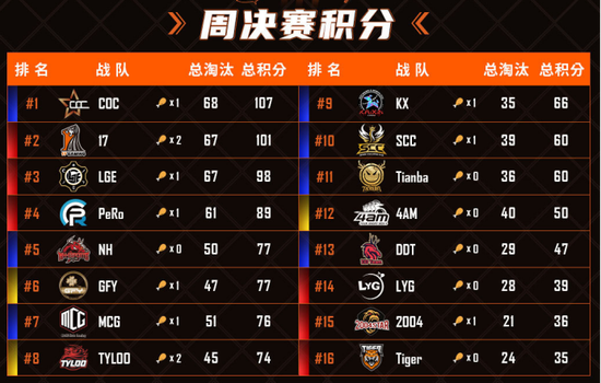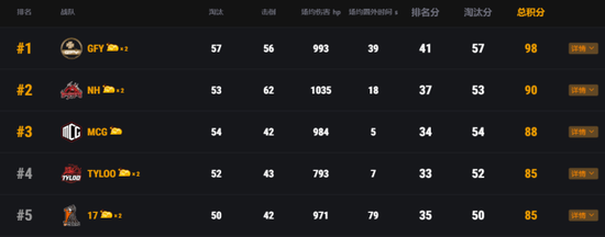 在第二周的周中赛中,GFY战队表现出了强大的统治力,以98分的总积分与57个总淘汰的数据,强势夺取本周常规赛积分第一名与淘汰榜第一。NH战队一扫首周阴霾,不仅以1035的场均伤害异军突起,还拿下了53个淘汰,以90分的总积分取得第二。MCG战队则依旧保持稳定的战斗状态,以两分的微弱差距屈居第三。除此之外,TYLOO战队与17战队均以85分的总积分分列第四、第五,率先确定周决赛席位。