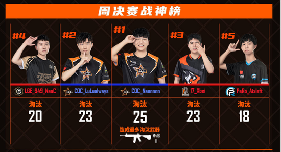 本周周决赛的激烈程度令人意外,周中赛位列第八的COC战队锋芒尽显,核心队员Nannnnn一展大将之风,在周决赛首日四场蛰伏后凭借一颗大心脏带队拿下最后一鸡,翌日带动队友LuLualways火力全开,周决赛12场分别斩获25和23个淘汰。两人在帮助队伍夺下周冠军宝座的同时,也顺势斩获本周战神榜一、二位,整队的场均伤害也顺利突破一千大关。