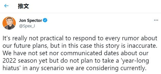 Jon Spector的推文中写道:“对所有关于我们未来计划的谣言都作出回应是不现实的,但在这种情况下,这个事情是错误的。我们还没有确定或沟通2022赛季的日期,但在我们目前考虑的所有情况下,都不打算进行‘长达一年的中断’”。