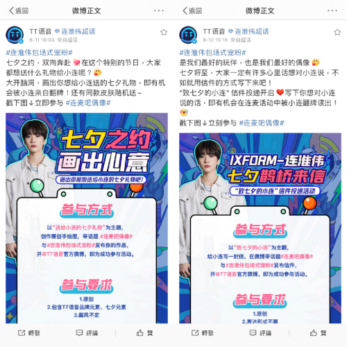 在直播前,TT语音深度洞察粉丝的需求,开启了一系列共创活动,给予粉丝正向引导。不仅邀请粉丝大开脑洞,画出“最想送给小连的七夕礼物”,还鼓励粉丝勇敢表达爱,以信件的方式向偶像“告白”。活动一经上线,激起了粉丝的热情参与。