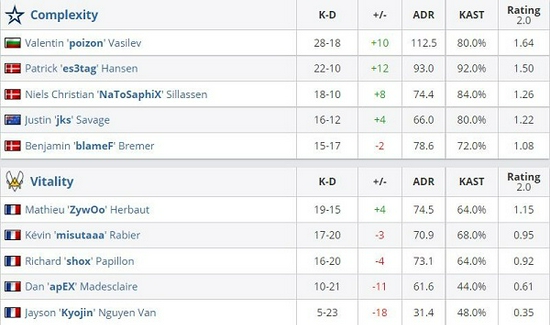 ESL Pro Leagues S14淘汰赛阶段首日,第二场比赛vitality 2-1战胜Complexity。双方在对手选图上表现出色,比赛直接快进到决胜图的对决,在决胜图荒漠迷城上apEX与shox两位老大哥扛起大旗,双双ADR破百带领队伍在进攻端取得13-2的领先,下半场complexity迸发出十足的韧性连续追分甚至一度掌握比赛节奏,但巨大的分差不容得他们有一点失误,最终输掉关键回合的coL还是倒在了法国战车的面前,vitality成功赢取淘汰赛开门红!