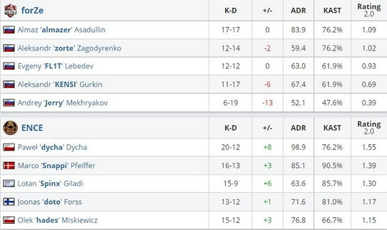梅开二度来到下半场后赢下手枪局的forZe终于迎来了喘息的机会,再次赢下首个长枪局后他们进一步缩小比分差距,好在dota残局三杀断了对手的连胜节奏。关键残局2v2,hades抓住关键timing击杀两人打开局面,ENCE抢先一步拿下赛点,最终局forZe经济不足还是倒在了ENCE脚下,比分16-11。