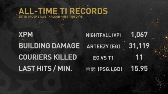 小组赛各选手的一些数据除此之外还有VP战队的Nightfall创造了最高XPM为1067的新纪录、EG战队的Arteezy创造了最高建筑伤害为31119的新纪录。而在EG战队与T1战队的比赛中,他们一共击杀了11次信使,同样打破了一项纪录。当然这项纪录和信使的改动有关,虽然TI9与TI10在数字上只隔了一位,但是这几年已经发生了太多的变化,边路商店的消失、中立物品的添加以及人手一只信使的改动让Dota2变得越来越有趣。