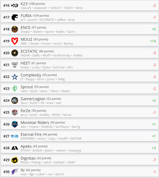 MOUZ在IEM卡托维兹通过了Play-In阶段,以9-12名计算,于是超过了MOUZ青训队,升至第19。其他队伍包括fnatic、哥本哈根火焰、ENCE皆有略微涨幅。