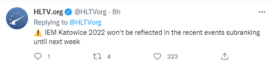 HLTV强调,只有在下周IEM卡托维兹 2022完赛后世界排名才会反映该项赛事带来的最终影响。