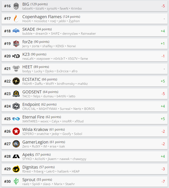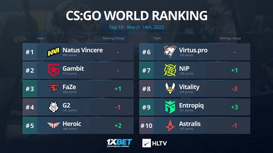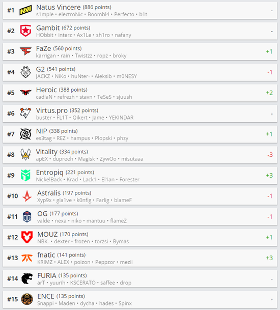 除FaZe外,其他队伍的排名也值得关注。Vitality在波兰的糟糕发挥作用在世界排名上,小蜜蜂已经落在Heroic、Virtus.pro和NIP身后。Entropiq晋级EPL 淘汰赛段,从而连升三名来到前十。