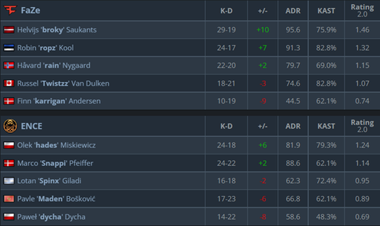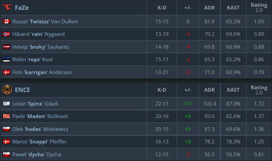 同样的A区进攻,FaZe也是手枪局平推进A扳平比分,稳稳收下eco局和强起局后FaZe将比分反超至10-8。关键长枪局FaZe一波道具打B正中ENCE四人防守的圈套,放慢速度的FaZe架住前压的ENCE两人,可Maden和dycha防守的A区固若金汤化解了攻势扳平比分,ENCE拿下eco局后将比分反超至10-11。关键长枪局ENCE主动前压拿到优势,但Twistzz突进A点成功下包,有惊无险拿回一分,选择刚枪的ENCE没能架住FaZe的B区攻势,保下的长枪也没能打出效果被FaZe反超比分。再次来到关键长枪局,FaZe选择夹B被前压的ENCE提前化解,控图的FaZe被前压偷人,一波打B虽然rain发挥拿到双杀,但hades回防一波三杀拿下残局扳平比分,eco的FaZe各点偷人拿到4V3优势一波出长管,可时间阻挡了karrigan的脚步没能放下雷包输掉1V1残局,各点前压的ENCE和FaZe在中段激烈交火,最终ropz被ENCE两人夹击无力回天,ENCE拿到13-15赛点。虽然一波冲B激烈交火打到1V1可后路回防的Spinx超出了ropz的架枪范围终结了比赛。