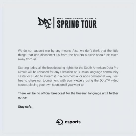 DPC南美联赛的组织者4D Esports在官方媒介上宣布已经停止俄语官方的转播,但允许社区自己转播比赛,包括商业比赛。