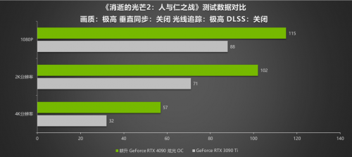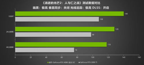 在光追游戏《消逝的光芒2:人与仁之战》中,GeForce RTX 4090 依然有不俗的表现:在极限画质下开启DLSS 3 质量模式后,1080P能跑到140帧,2K分辨率能跑到128帧,4K分辨率能跑到118帧,相较于GeForce RTX 3090 Ti有30%~55%的性能提升。这个帧数对于第一人称游戏来说也可以达到完美游戏的标准,能很好地满足各玩家不同的需求。