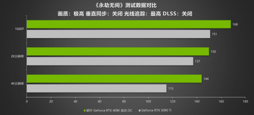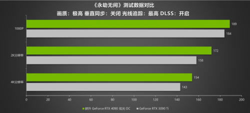 作为一款在线竞技类游戏,《永劫无间》对帧数和延迟的要求会比一般的游戏还要高。而在高分辨率下,RTX 4090能跑到144帧以上的电竞帧数,开启DLSS 3 后的RTX 4090 能跑到154帧及以上,在1080P更是能跑到近200帧。而且在游戏过程并无任何不稳定、卡顿等现象出现,完全满足竞技选手对于高帧数高刷新率的需求。