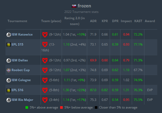 团队的进步并非立竿见影,在PGL安特卫普Major上,他们虽然惊险进入预选赛,但在2-0开局下接连输给OG、FaZe以及Vitality后他们还是只能止步于此,尽管frozen拿到了1.17的个人Rating。