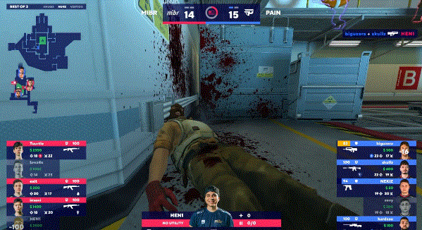 图二的Nuke双方经历了双加时大战,作为paiN的选图,MIBR在防守方拿到9-6的优势,下半场paiN的刚枪翻盘为他们吹响了反攻的号角,一度反超比分。好在MIBR这边exit、insani与Tuurtle三叉戟顶住压力连续在关键局拿分成功将比赛拖入加时。第一个加时双方互有来回,不分胜负,但是MIBR凭借在第二个加时先做CT的优势连拿三分击毁了paiN的自信心最终22-18拿下图二。